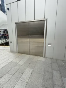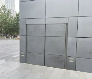 Around the Perelman Performing Arts Center at the World Trade Center, the flood-protection design includes passive flood barriers integrated into the building’s access points. One key component of that design is a series of Hydro1® Pedestrian Flood Doors and barriers placed at ground-level entry points. These are purposely designed flood doors that stay in place 24/7 and act as watertight barriers if floodwaters rise.